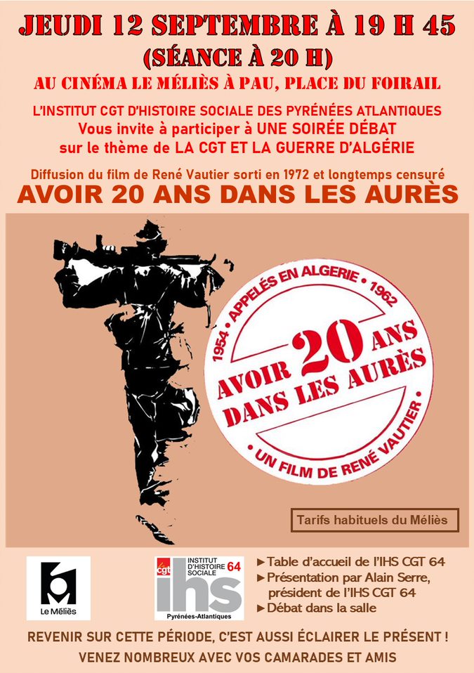 Soirée débat au Méliès le 12 septembre à 19h45 sur le thème la CGT et la guerre d'Algérie autour du film "Avoir 20 ans dans les Aurès"